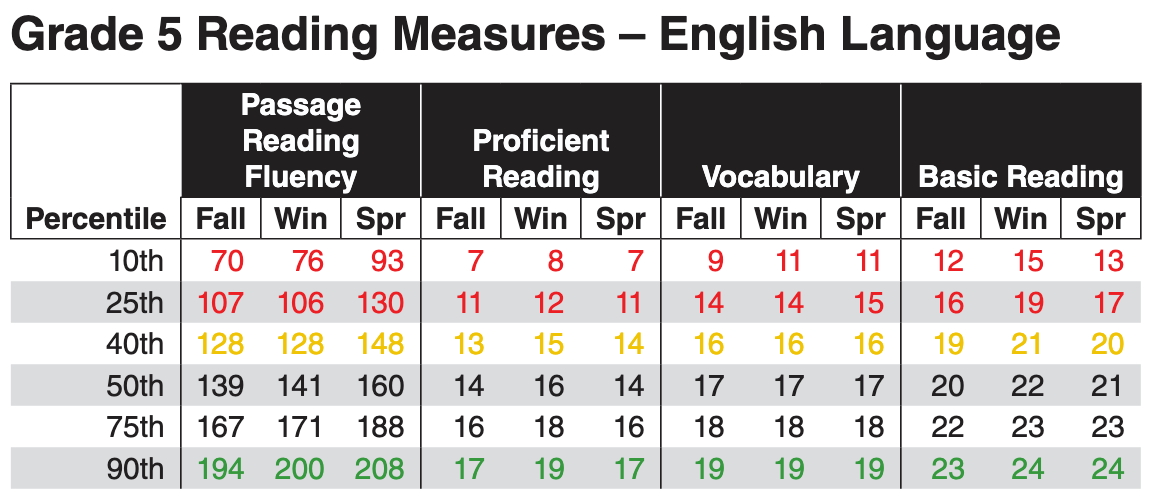 The Progress Monitoring Scoring Guidelines lists the 25th, 40th, 50th, and 90th percentiles. We also offer an additional document called the Detailed Norms Table which lists every percentile. Both documents can be found under the Reports tab on your account dashboard.