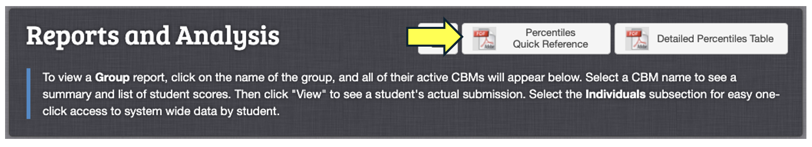 Next, at the top of the page in the "Reports and Analysis" box, you'll see "Percentiles Quick Reference". Click the box to open a PDF with percentile tables for each grade and measure.
