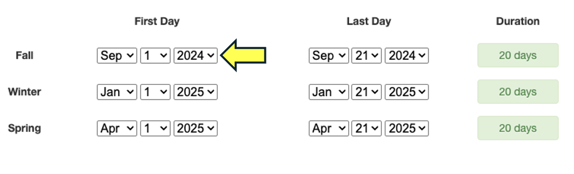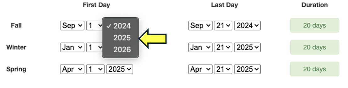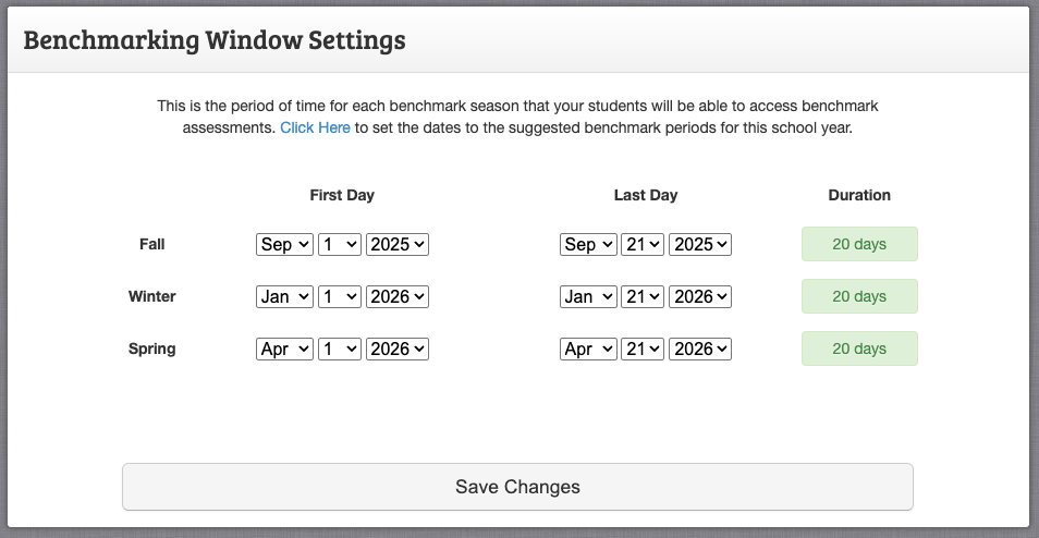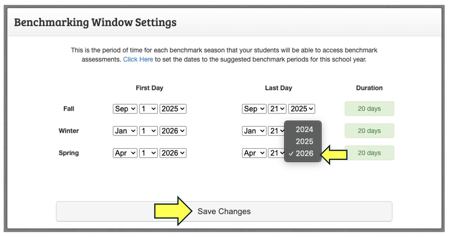 At the top of the page is the "Benchmark Window Settings" section, here you can adjust the opening and closing dates for Fall, Winter, and Spring testing by clicking on the drop-down arrow next to the date and adjusting it to the needed day/month/year. In this case the date range needs to be updated from the 24-25 year to the 25-26 year. (pictured below)