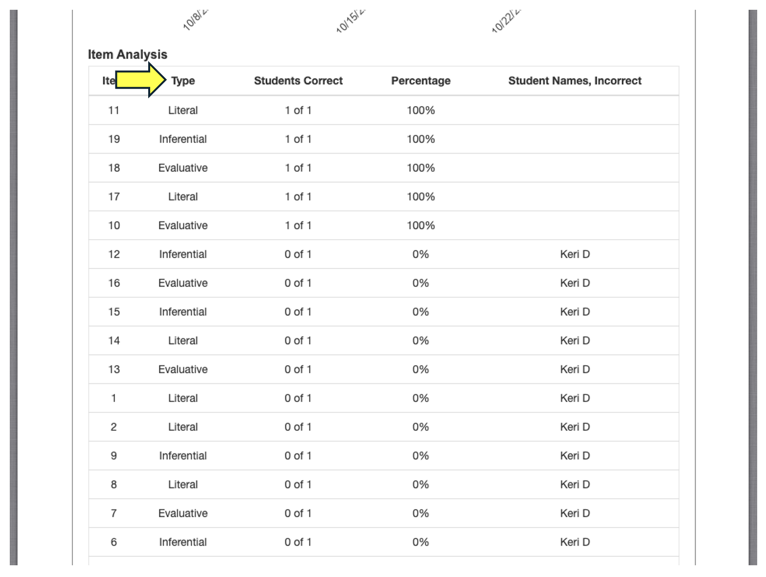 After clicking on the test title, in the "Summary" box, scroll down to the "Item Analysis" section and here you'll find the "Type" of reading comprehension question asked.