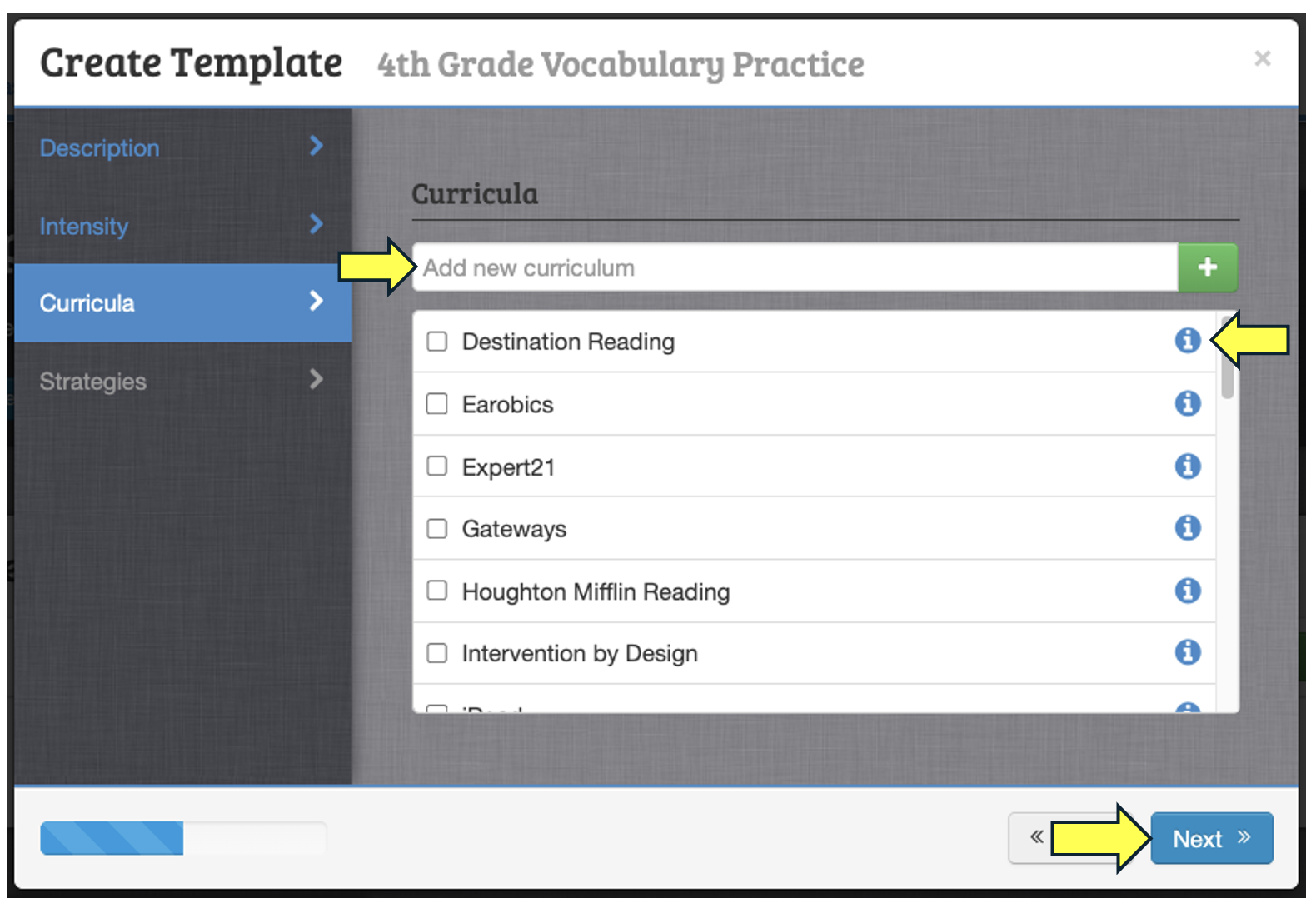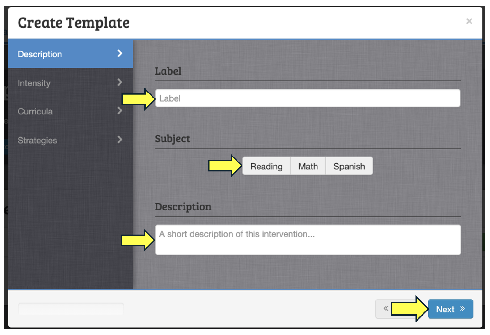 On the first screen, enter a short but descriptive label (this will appear on student Individual Graphs), select the subject area (Reading, Math, or Spanish), and add a brief description of the intervention in the "Description" section. When finished, click "Next" to advance.