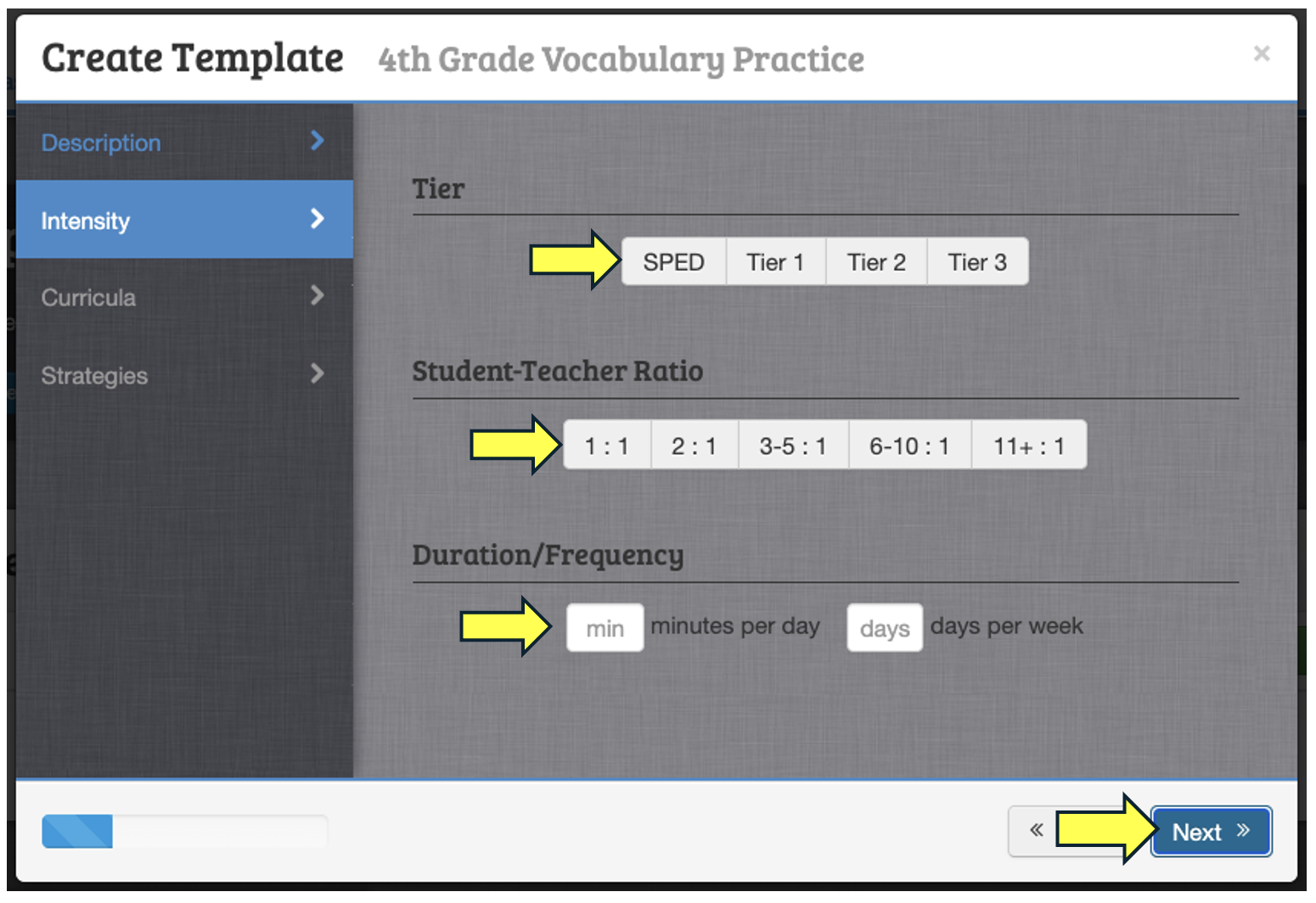 On the second screen, enter which tier the intervention falls within, select the student-teacher ratio, and indicate the duration and frequency with which the intervention is being provided.
