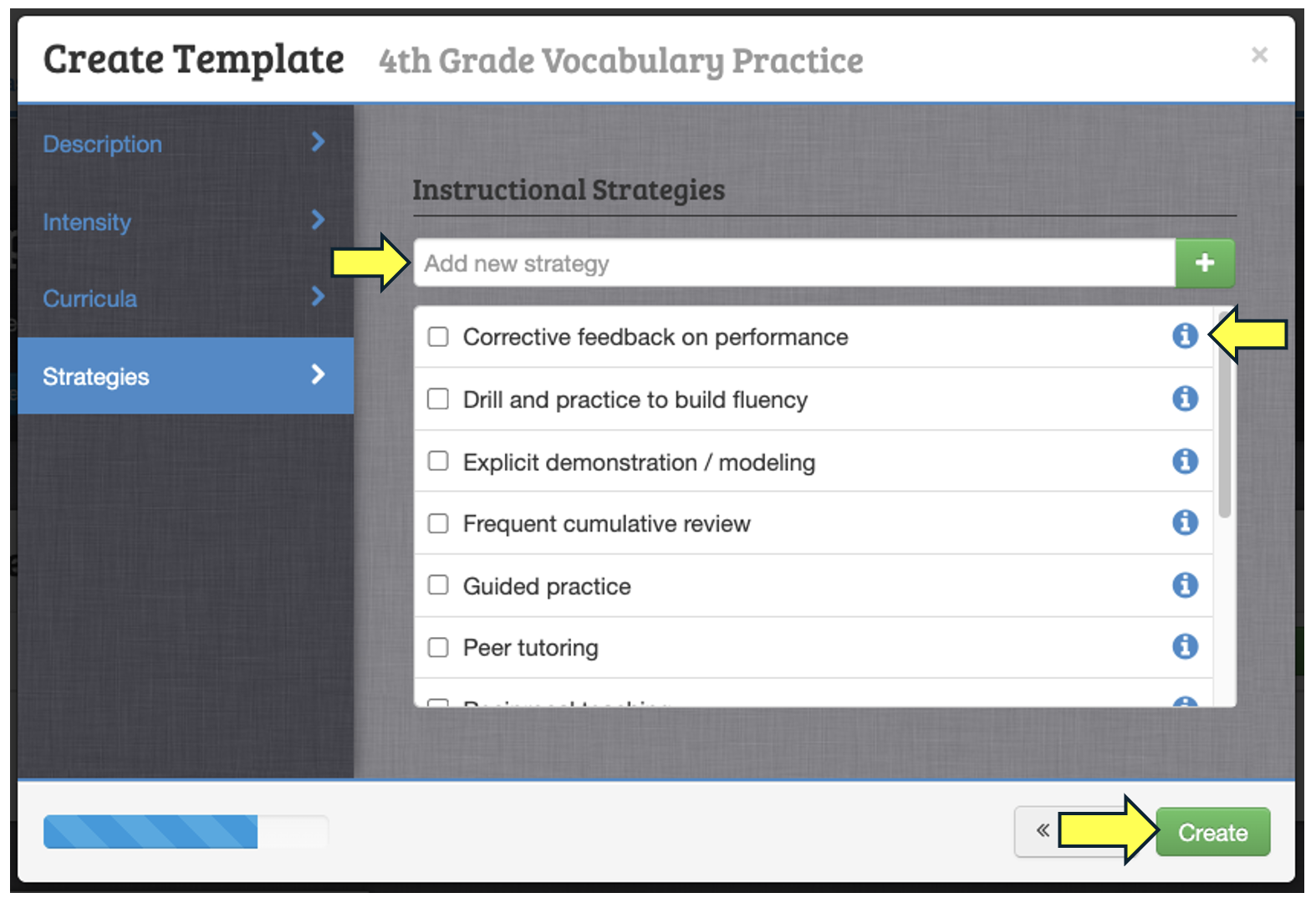 On the fourth screen, select the instructional strategies to be provided. The list of strategies comes from the What Works Clearinghouse's analysis of instructional strategies with scientific evidence of effectiveness. Unlike the curricula, strategies are intended to be equally applicable across different subject areas. Hover over the icon (or tap, on mobile devices) to display information about each of the listed strategies. If the strategy to be used is not on the list, enter the name of the strategy into the 'Add new strategy' text box and click on the green "+" button to add a custom strategy to the list of options.