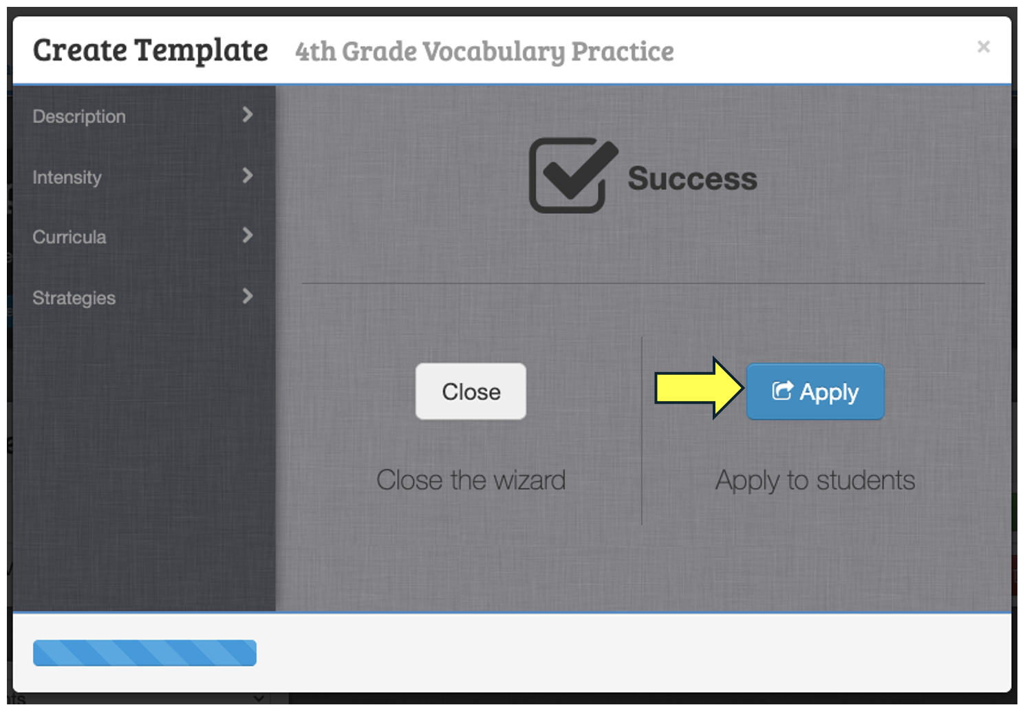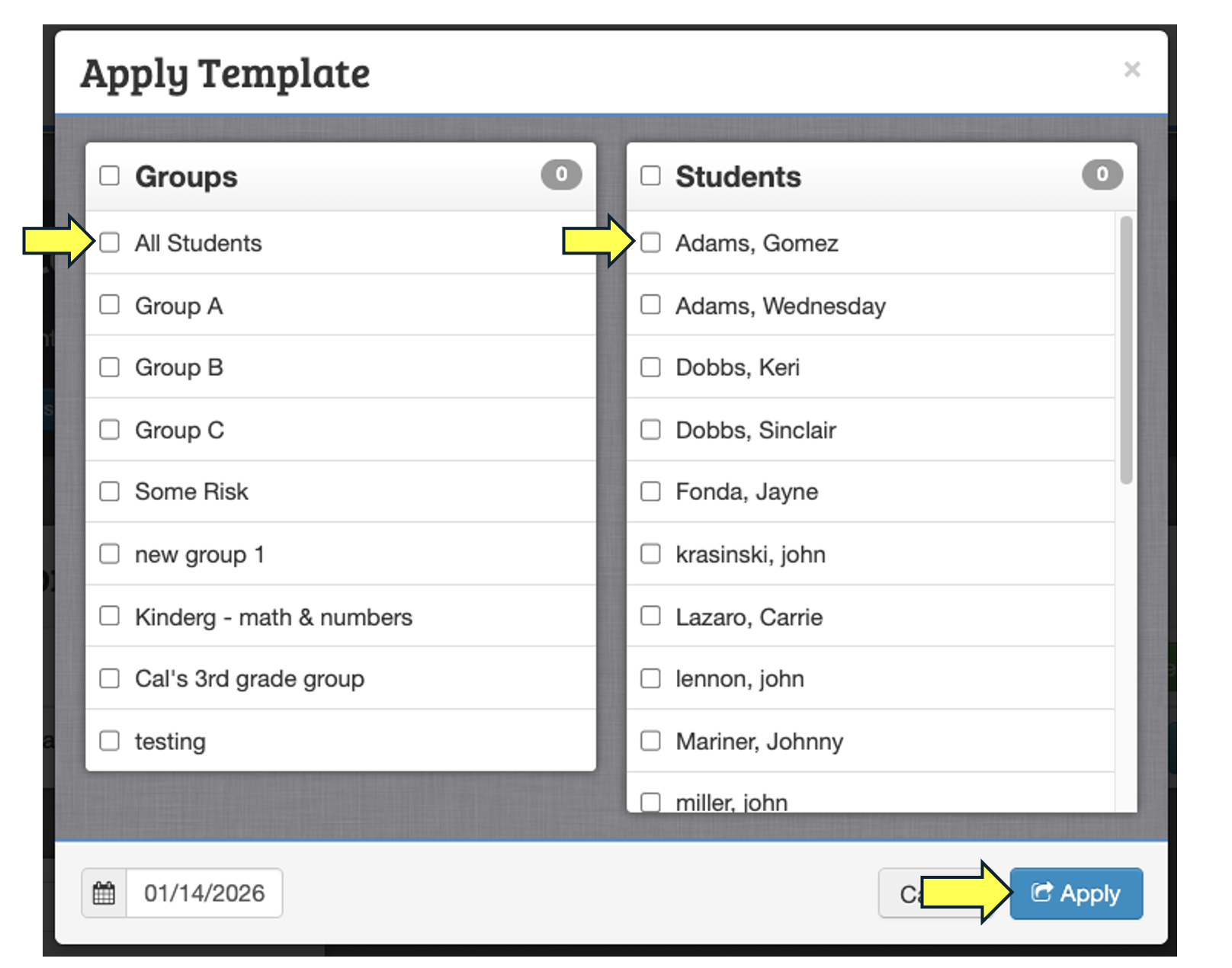 Last, click on the "Apply" button to assign the intervention to individual students or groups and indicate the date on which the intervention will begin.