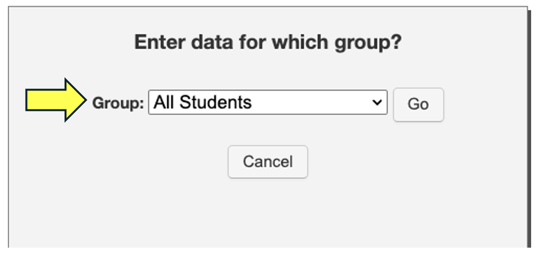 If you have multiple "Groups" set up, use the drop-down menu to find the correct group. If you have no groups created, the program will populate a test form for each student, at which point you can scroll down the list to locate the student taking the test.