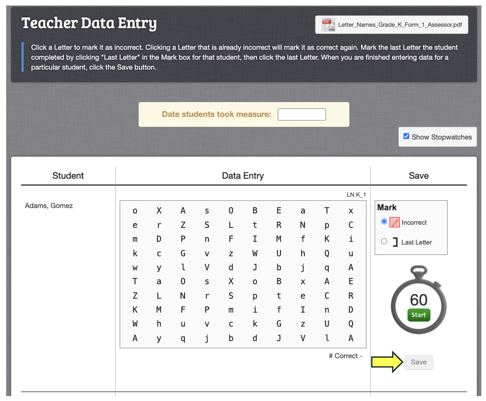 The next page will show a copy of the test form and a stopwatch for each student in the group you selected. Follow the standardized testing directions to administer the form, then save the results when you're done.