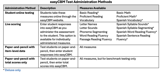 easyCBM Teacher Edition supports both benchmark testing (Deluxe only) and progress monitoring. Measures can be administered in different ways, depending on the type of testing required. Benchmark testing is conducted on grade-level materials three times per year (Fall, Winter, and Spring), while progress monitoring can be administered more frequently to students receiving additional supports to evaluate whether they are making sufficient progress.