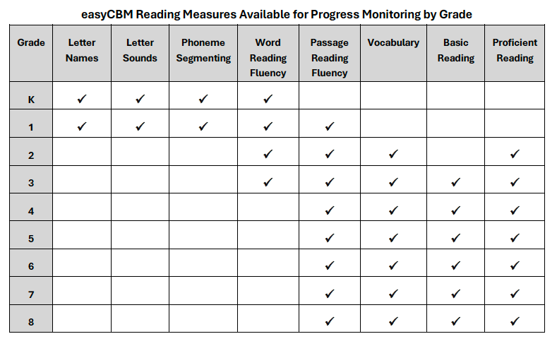 The following table indicates the grade levels in which progress monitoring forms are available for each of the measures. Some measures have progress monitoring forms for grades in which they are not used for benchmark testing, to support students who are still working on those skills.