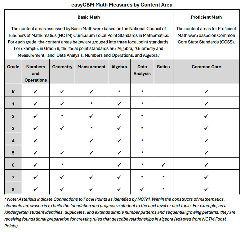 For benchmark testing, both assessments measure a range of skills closely aligned with a variety of state content standards in mathematics. The Basic Math measures were developed using the National Council of Teachers of Mathematics (NCTM) Focal Point Standards as an initial framework, with benchmark forms including test items from all three focal point standards at each respective grade level. The Proficient Math measures were developed using the Common Core State Standards (CCSS) as an initial framework. In addition to items aligned with the respective grade level, the Proficient Math benchmark measures also include a small number of items from prior and subsequent grade levels to enhance the test's accuracy as a universal screener, thereby extending the population of students whom it reliably measures.