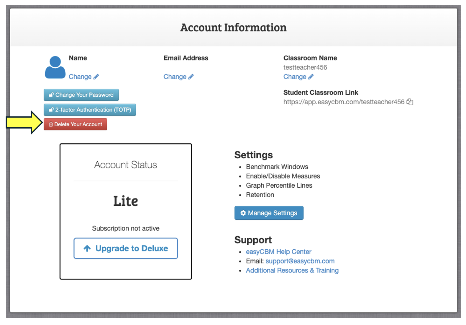 You will be directed to the Account Information page. From here click on the red "Delete Your Account" button. **Keep in mind that this will totally delete all account and student data. If you need to save any documents before deletion please refer to our article on Printing and Saving Student Data.
