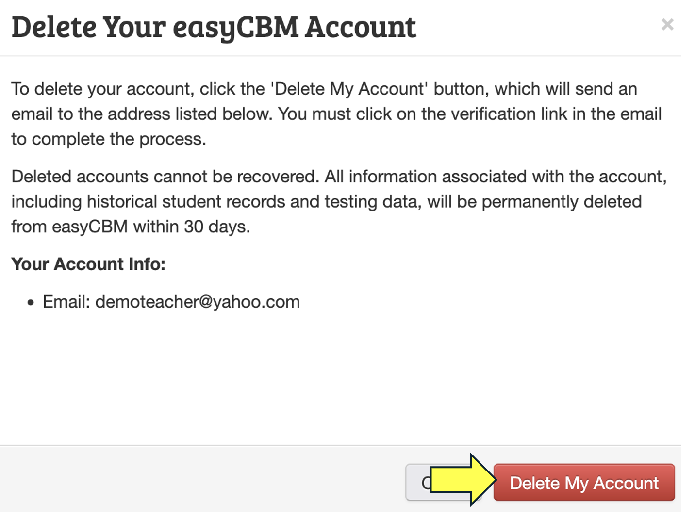 Once you have confirmed that you have saved or printed out all needed student data. Click the red "Delete My Account" button to permanently delete your account.