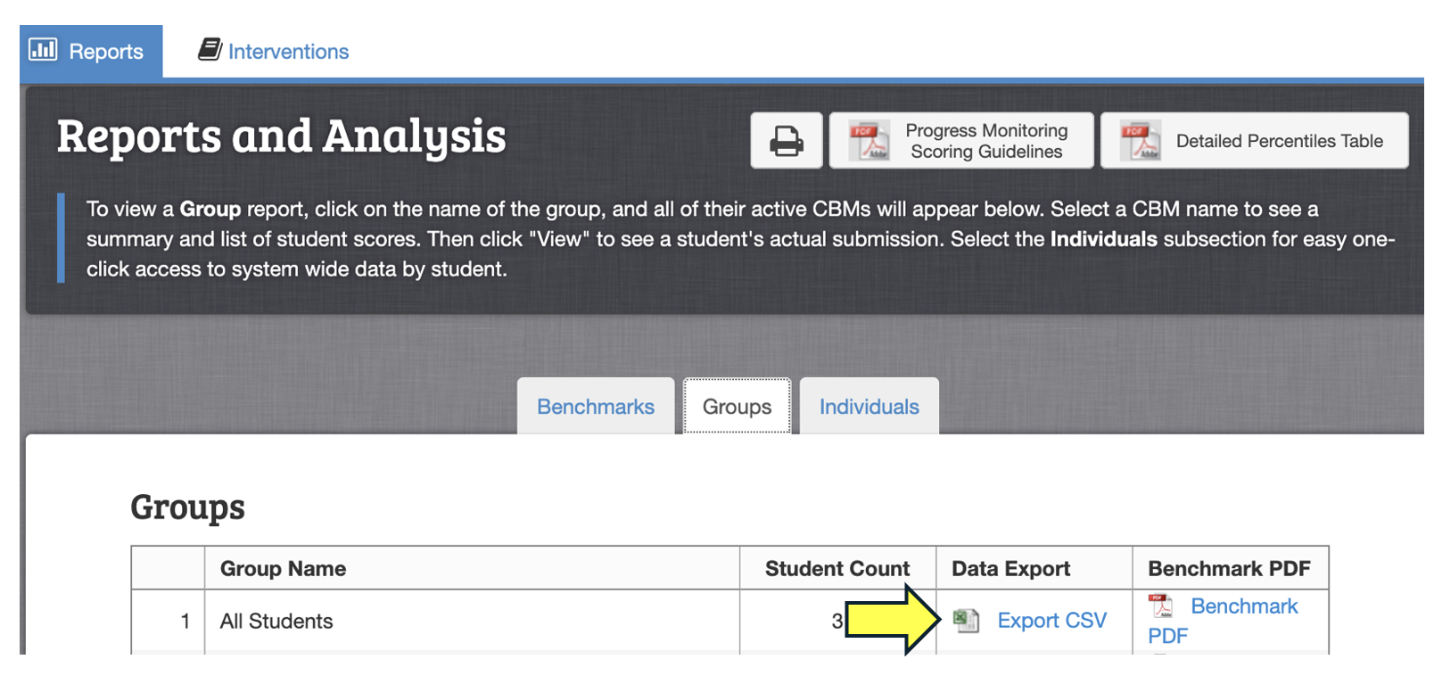 To export data, login to your easyCBM Dashboard and click on the Reports tab.