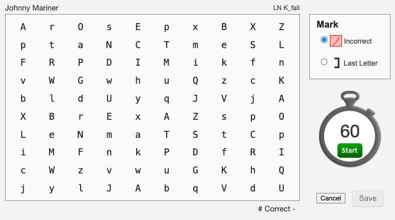 A built-in timer is provided for ease of use. We recommend a device with touch screen technology for live scoring, so that students are not aware when an error is being marked (audible 'clicks' to mark errors introduce potential measurement error and should be avoided).