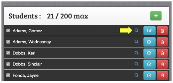 Next, locate the student whose history you wish to view in the “Students" column, then click the blue "Magnifying Glass" icon to the right of the student's name.