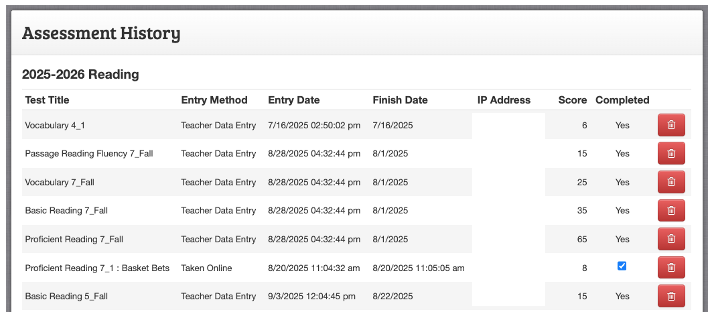 Here you can find the Entry Date, Finish Date, IP Address and score. You'll also notice that the titles of the assessments are structured differently. Note that if you see an assessment title with a "Season" (Fall, Winter, Spring) that indicates the assessment is a Benchmark Test. The titles without a "Season" are Progress Monitoring Measures.
